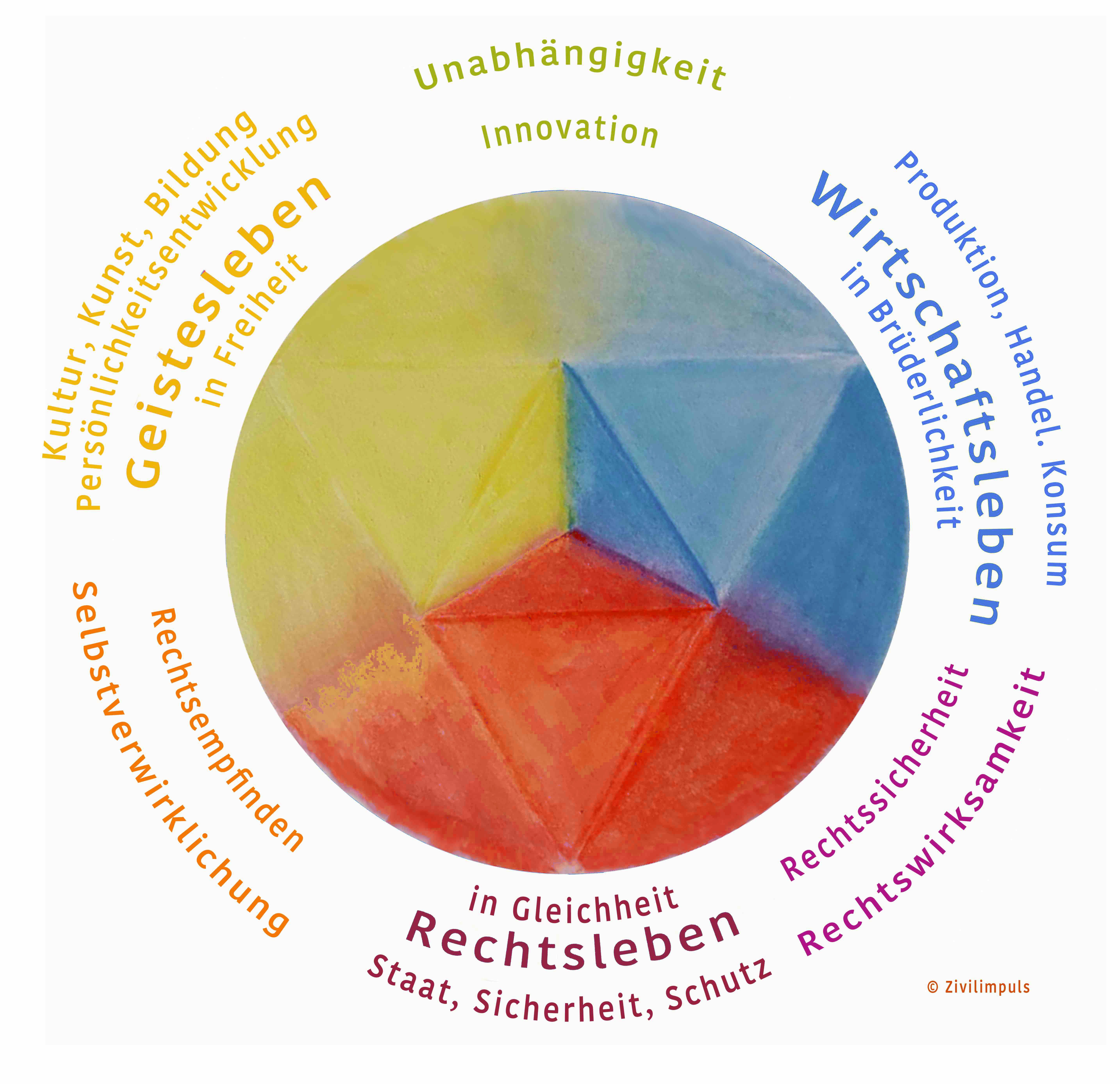 Das erste ist: Man kann in der Gesellschaft “organisch”, d.h natürlicherweise, drei Gebiete voneinander unterscheiden. Die Unterscheidung dieser drei Gebiete erfolgt empirisch, d.h man kann “sehen”, dass es drei verschiedenen Gebiete sind. Man muss es weder glauben noch bloss hypothetisch annehmen, man kann es hinterfragen und dann kann man es sehen. Das ist deshalb von Bedeutung, weil immer wieder Menschen denken, die Dreigliederung sei eine Ideologie, oder eine Erfindung R. Steiners. Das ist nicht der Fall. Dreigliederung bedeutet: Wir unterscheiden drei verschiedene Gebiete, weil wir drei verschiedene Gebiete beobachten können. Ganz einfach.